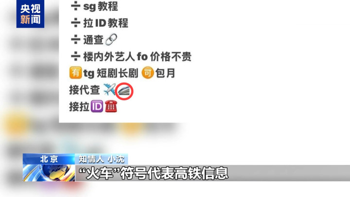 知情人小沈:黄牛对购买信息的人一般都非常谨慎,通常都是说一些暗语,比如说字母“tg”是“通告”的缩写,字母“sjh”是“手机号”的缩写;“飞机”符号代表航班信息,“火车”符号代表高铁信息,“ID”字符代表身份证号。