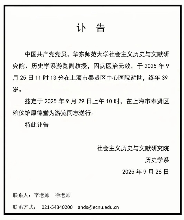 今天(9月26日),华东师范大学历史学系发布讣告:中国共产党党员,华东师范大学社会主义历史与文献研究院、历史学系游览副教授诚金资产,因病医治无效诚金资产诚金资产,于2025年9月25日11时13分在上海市奉贤区中心医院逝世,终年39岁。